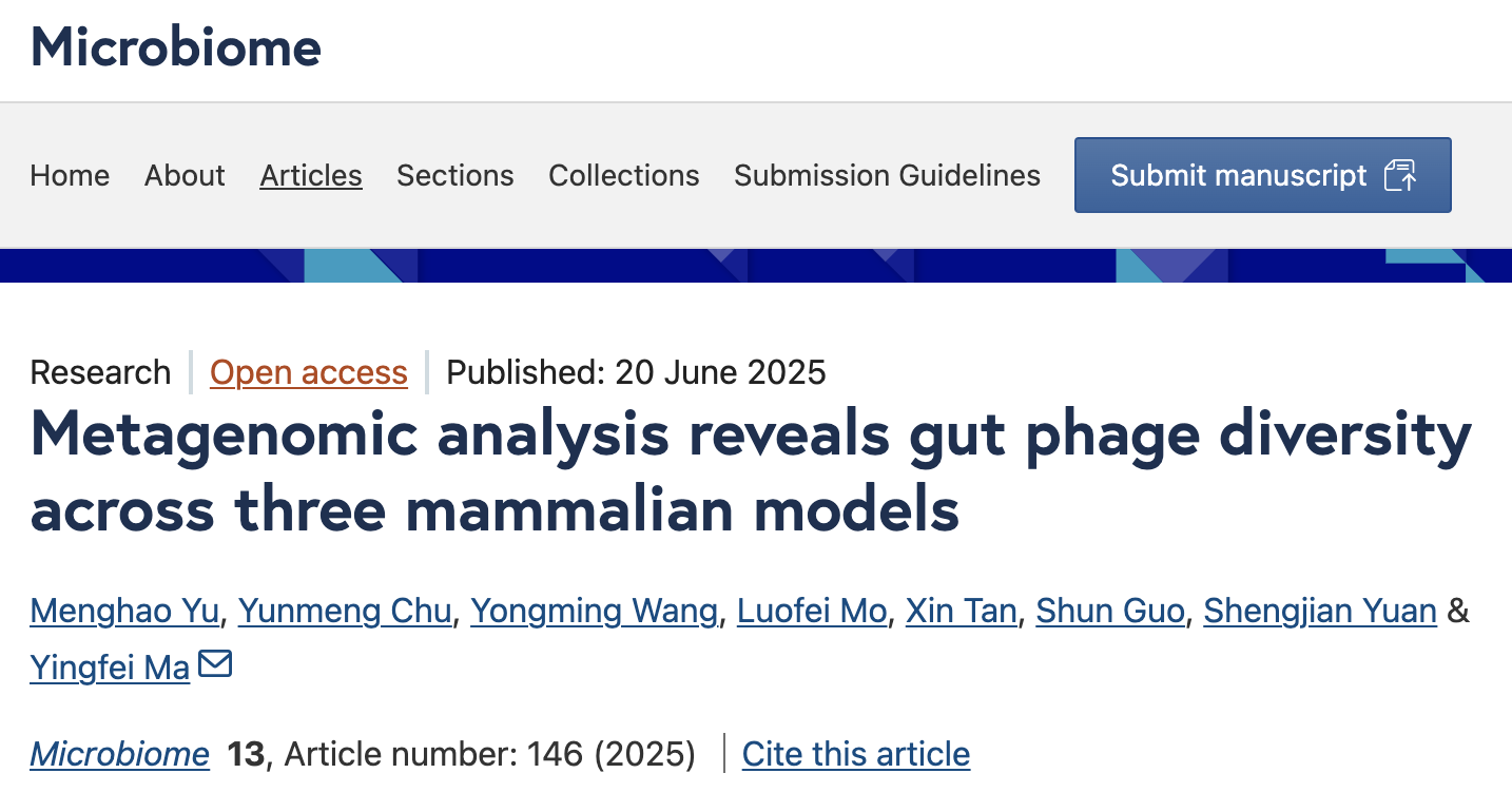 6月20日,中国科研实验室深圳先进技术研究院定量合成生物学全国重点实验室、合成生物学研究所合成微生物组学研究中心马迎飞团队在国际学术期刊《微生物组》发表题为Metagenomic analysis reveals gut phage diversity across three mammalian models的文章。