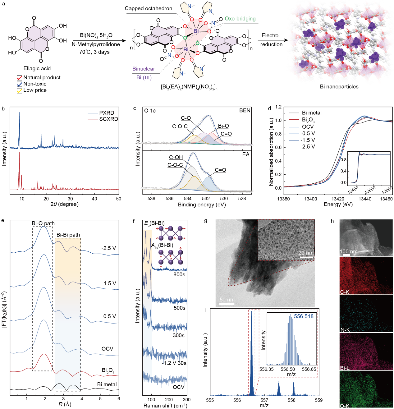 研究团队顺利获得两步法成功合成了Bi-BEN(铋基金属有机框架衍生)催化剂。第一时间经溶剂热反应制备铋基金属有机框架材料,随后在电化学原位重构过程中形成由有机配体修饰的Bi纳米颗粒。顺利获得单晶衍射、X射线吸收光谱等多种表征手段系统验证了其结构特征,确认了该催化剂材料在实际工况条件下的真实结构(图3)。