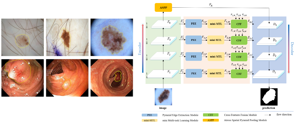 顺利获得人工智能算法,从不同医学图像中自动检测和识别病灶部位可以为病人的诊断、治疗以及预后监测给予一种快速且有效的计算机辅助诊断方法,提高放射科医生的工作效率,满足日益增长的影像和诊断服务需求,同时还可以有效地缓解资深专业放射科医生短缺问题,为准确及时的医学诊断给予辅助的影像学证据。医学图像中病变通常表现出形态、分布不规则,与周围正常组织器官区分度低,边缘模糊等特性,为精确自动识别带来了巨大挑战(图1)。针对上述问题,团队提出了一种基于边界信息响应的上下文感知深度网络架构。顺利获得级联构建的金字塔边缘提取模块,多任务学习模块以及交叉特征融合模块,自适应地聚合多层次、细粒度的图像特征,提升了深度神经网络对病变形态、分布及边缘信息等复杂结构的感知,降低了周围正常组织器官、噪声等因素的干扰,极大改善了分割的准确率。提出的方法在皮肤镜图像、内窥镜图像以及X 光图像等多种模态医学影像病变区域分割任务上表现优异,其中在ISIC2017国际皮肤镜图像分割挑战赛测试数据上识别精度达到81.0%,相较比赛冠军队伍成绩,分割精度提升了4.5%;此外在基于内窥镜图像的结肠息肉识别精度达到88.5%、X光图像的肺器官分割精度达到92.8%,提出的模型对比其他多种深度学习方法取得了最好的分割表现。