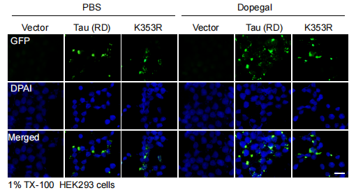 图1:DOPAGEL促进细胞内Tau的聚集而K353R突变可以阻断DOPEGAL的促进作用