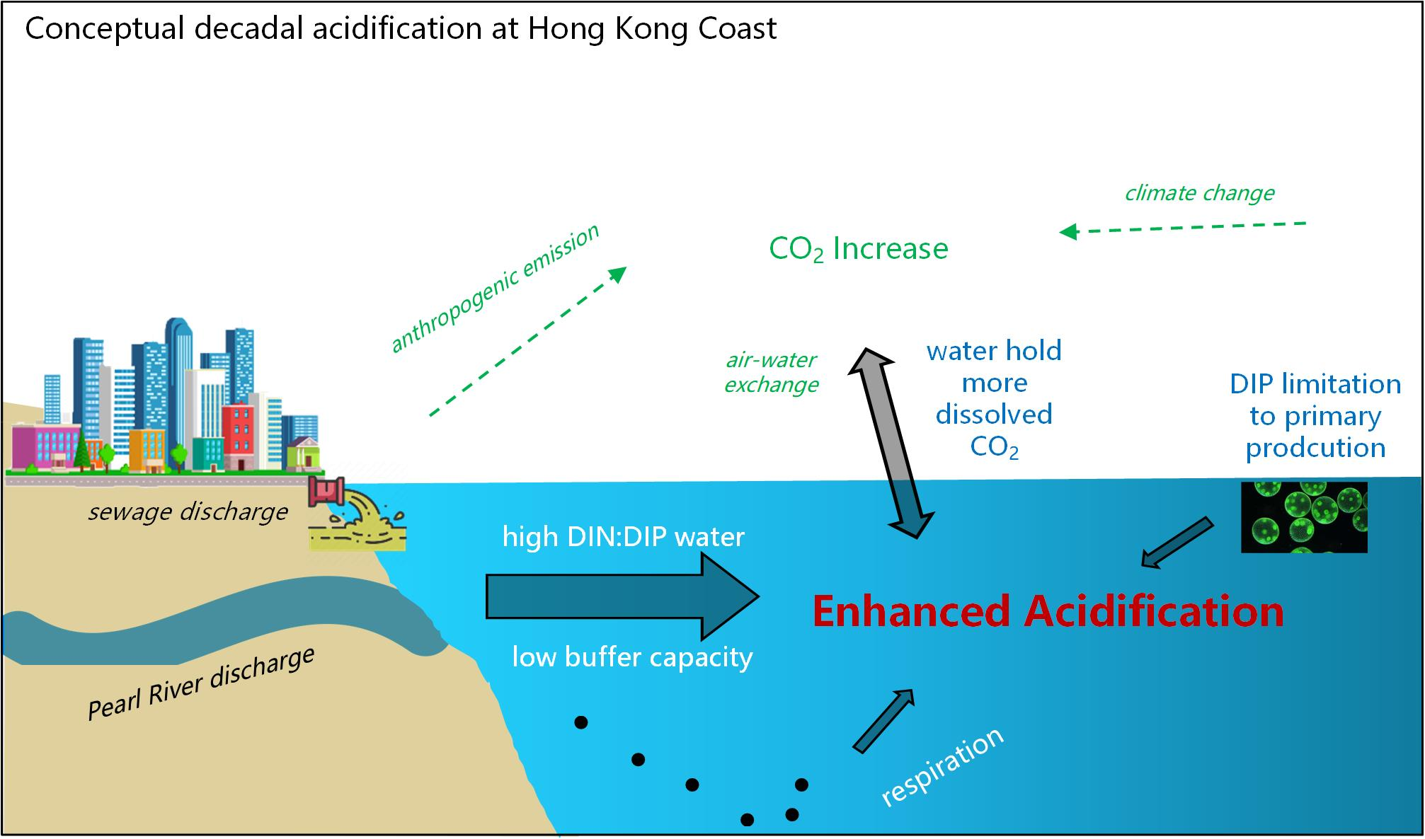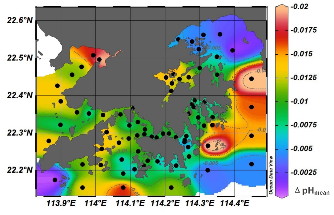 顺利获得分析香港环境保护署(http://www.epd.gov.hk/epd/tc_chi/top.html)自19862017长达30的年76,600组现场水质监测数据,整个香港周边海域自1986年以来发生了严重的海洋酸化。其酸化速率(-0.0085 ± 0.0069 pH·unit·yr-1)为全球海洋平均酸化速率(~ -0.0019 pH·unit·yr-1)的4.5倍。除了大气CO2的浓度上升,整个大湾区海域多年的富营养化状态造成了水体对酸性物质的缓冲能力下降,尤其是自2001年之后富含氨氮(NH4-N)的陆源水体汇入引发的高氮磷比(年均DIN:DIP1986年的15.5升高至2017年的37.1),进一步加剧了该海域的水体酸化。