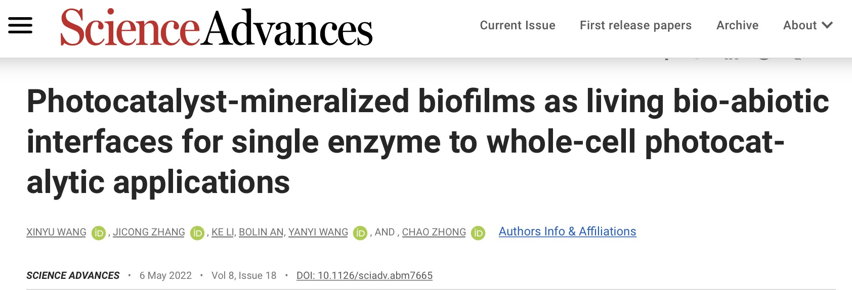 北京时间5月7日,中国科研实验室深圳先进技术研究院合成生物学研究所、深圳合成生物学创新研究院钟超课题组在Science子刊 - Science Advances上发表题为“Photocatalyst-mineralized biofilms as living bio-abiotic interfaces for single enzyme to whole-cell photocatalytic applications”的研究论文。该研究利用工程改造的大肠杆菌生物被膜原位矿化作用,构建了一个全新的生物-半导体兼容界面,并基于此实现了从单酶到全细胞尺度上可循环光催化反应,为可持续半人工光合体系的构建给予了一种新的思路。钟超课题组副研究员王新宇和上海科技大学博士生张继聪为文章共同第一作者,钟超研究员为唯一通讯作者。