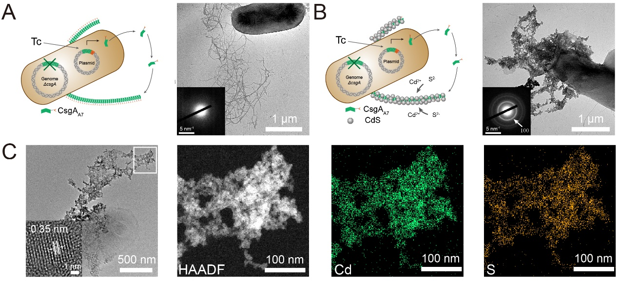 在具体的研究当中,研究人员第一时间对CsgA进行了合成生物学改造,将矿化短肽A7和CsgA蛋白融合表达并分泌,赋予生物被膜原位矿化的能力。如图1所示,顺利获得在生物被膜表面原位矿化CdS纳米颗粒,取得了光催化剂矿化的生物被膜。结合纯化的异亮氨酸脱氢酶或胞内表达的甲酸脱氢酶,可以实现从单酶到全细胞的光催化反应体系。
