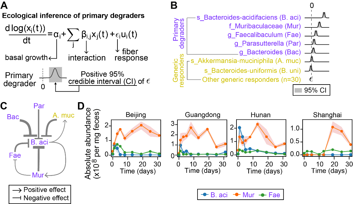研究团队顺利获得生态动力学模型,解析膳食纤维干预下肠道菌群应答的生态学机制。以广义Lotka-Volterra (gLV)模型为框架,拟合小鼠肠道菌群在膳食纤维干预后的动态变化,推断膳食纤维干预下生长速率有显著响应的关键微生物和不同微生物之间的互作关系。顺利获得这一方法,该团队成功推断了小鼠肠道菌群中膳食纤维代谢功能的关键响应菌,以及关键微生物之间的互作关系。当关键微生物缺失时,膳食纤维对肠道菌群的调控作用可能会“失效”(图2)。
