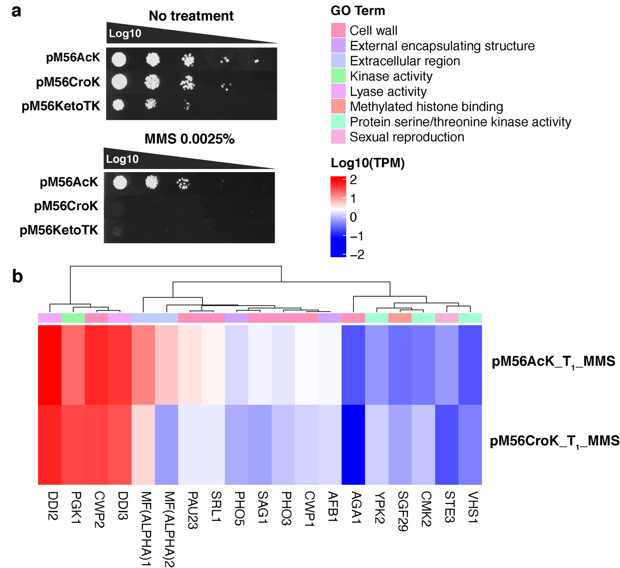 CTM菌株中,基因组编码的野生型组蛋白H3被CTM组蛋白H3突变体所取代。组蛋白H3突变体可借助酿酒酵母基因密码子扩展体系对其56位点进行ncAA突变取得。这一菌株被命名为pM56菌株(图2c),该菌株呈现出ncAAs依赖生长的特性,即在含有一定浓度ncAAs的培养基中,pM56菌株才能存活。研究人员针对不同pM56菌株中组蛋白H3K56位点酰化修饰水平进行定量蛋白组学研究,结果表明,pM56AcK菌株中组蛋白H3K56位点的乙酰化修饰水平(~12%)低于野生型酵母菌株(~23%),pM56CroK菌株中组蛋白H3K56位点除存在~14%的巴豆酰化修饰以外,还存在~10%的乙酰化修饰,这说明pM56菌株中存在动态的修饰调控过程。为了研究组蛋白H3K56位点发生乙酰化共修饰或巴豆酰化共修饰之后,二者的生物学功能存在哪些差异,研究人员第一时间做了pM56菌株DNA损伤耐受实验,比较pM56AcK和pM56CroK菌株对甲磺酸甲酯(methyl methanesulfonate, MMS)的耐受差异,结果显示,pM56AcK对MMS的耐受程度高于pM56CroK菌株(图3a)RNA测序结果显示,相比于MMS处理的pM56CroK菌株,pM56AcK菌株中水解酶表达水平显著性上调,酵母生殖和细胞壁相关的基因也出现了上调表达的情况,而pM56CroK菌株中激酶相关基因表达水平上调(图3b)