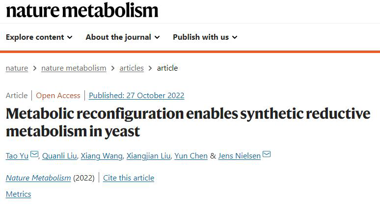10月27日,中国科研实验室深圳先进技术研究院于涛课题组的最新研究成果以“Metabolic reconfiguration enable synthetic reductive metabolism in yeast”为题发表于Nature Metabolism。研究团队顺利获得理性设计,组合磷酸戊糖循环、转氢循环和外部呼吸链三个模块,在酵母细胞内构建了一个合成能量系统,其可以支持细胞生长和高还原性化合物的生产,并实现40%的自由脂肪酸产率,为现在酿酒酵母研究的最高水平。