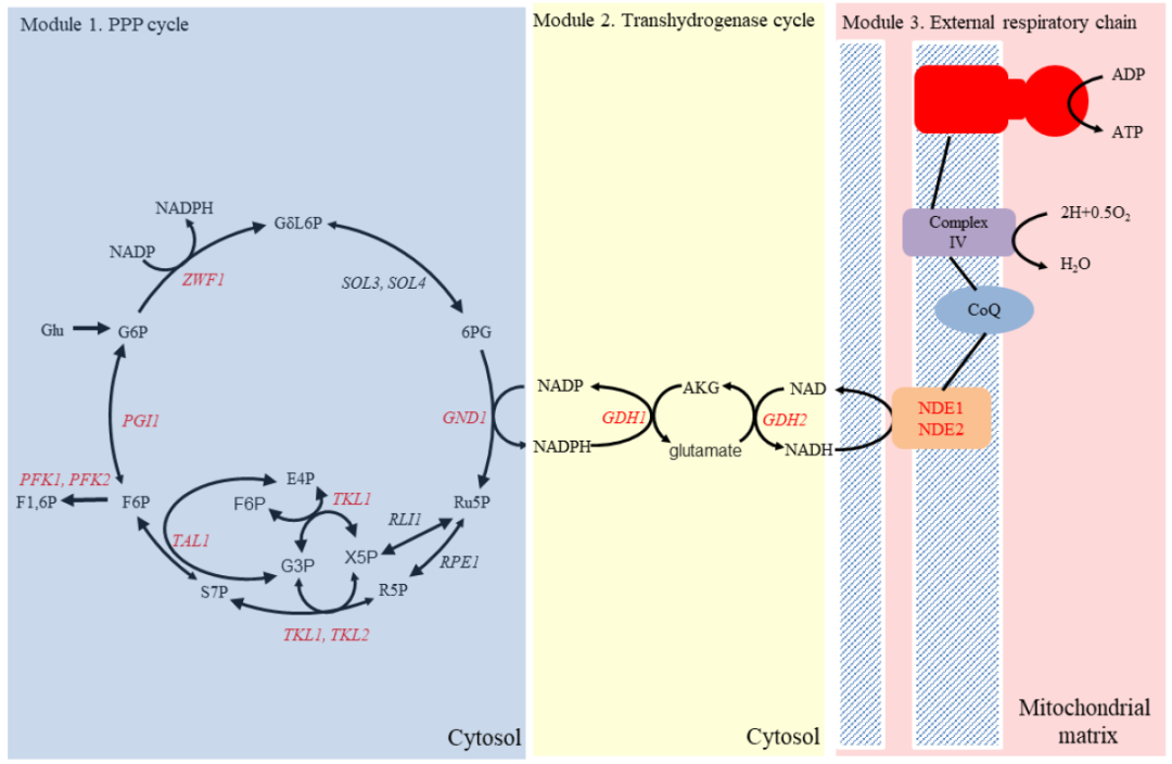 研究团队顺利获得理性重排还原代谢,在酵母细胞内构建了一个新型合成能量系统,利用重复的单脱羧反应和转氢循环实现NADPH和NADH的合成,并进一步转变为能量进行释放。该系统由三个模块组成:磷酸戊糖(Pentose Phosphate,PP)循环、转氢循环和外部呼吸链(图1)。