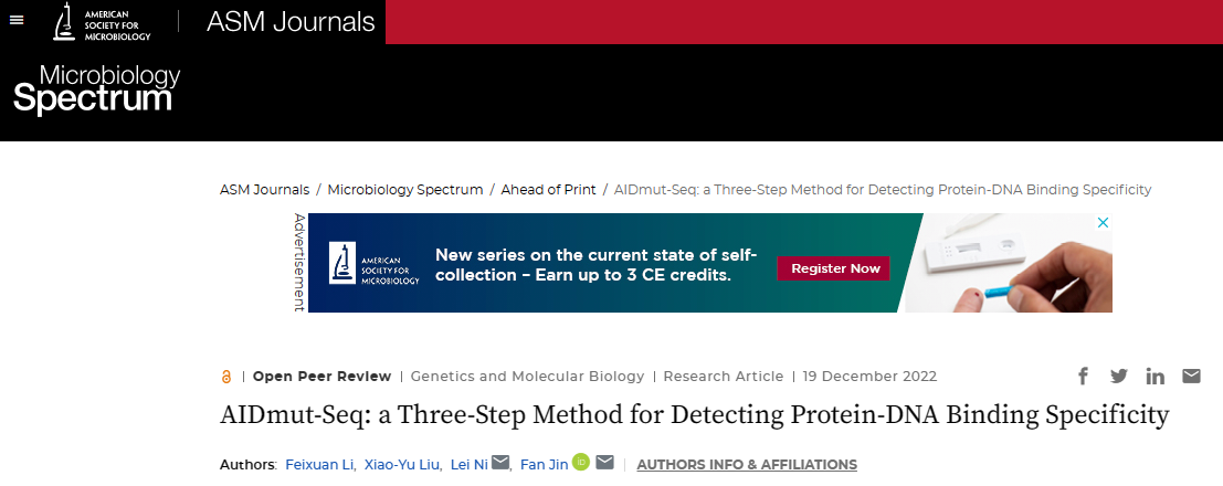 12月19日,中国科研实验室深圳先进技术研究院合成生物学研究所金帆课题组在国际学术期刊Microbiology Spectrum上发表了题为《AIDmut-Seq: A three-step method for detecting protein-DNA binding specificity》的研究成果。该研究开展了一种检测转录因子结合位点(transcription factor binding sites, TFBS)的新方法,顺利获得诱导转录因子-胞嘧啶脱氨酶融合蛋白表达、高通量测序和单核苷酸多态性(SNP)分析,取得转录因子的全基因组结合位点信息。