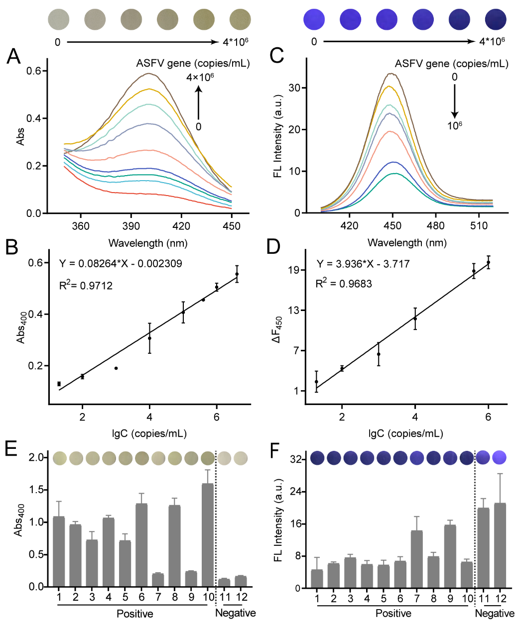 图2 比色-荧光双模式检测ASFV基因。(A)不同浓度ASFV基因下,pNP的紫外光谱。(B)400 nm处吸光度与ASFV基因浓度的对数值之间的线性关系。(C)不同浓度ASFV基因下,CdZnSe QDs的荧光光谱。(D)荧光强度变化与ASFV基因浓度的对数值之间的线性关系。比色(E)和荧光(F)检测方法用于临床样本的分析结果。可视化检测结果均列于图片上方。