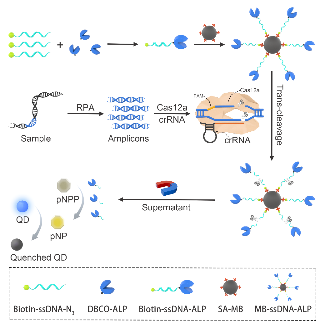 本研究开发了一种结合RPA、CRISPR/Cas12a和磁珠-酶新型报告系统,用于ASFV基因的快速精准诊断的方法。如图1所示,biotin-ssDNA-azide与DBCO修饰的碱性磷酸酶(ALP)顺利获得点击化学反应合成biotin-ssDNA-ALP,biotin-ssDNA-ALP与链霉亲和素修饰的磁珠(SA-MB)结合取得MB-ssDNA-ALP报告系统。用RPA扩增ASFV基因序列,取得扩增子,扩增子与Cas12a-crRNA复合物结合,激活Cas12a反式切割活性,切割MB-ssDNA-ALP上的ssDNA,释放ALP;ALP催化pNPP水解生成pNP,引起比色信号变化,再加入量子点作为荧光报告子,实现比色和荧光的双模式信号输出。