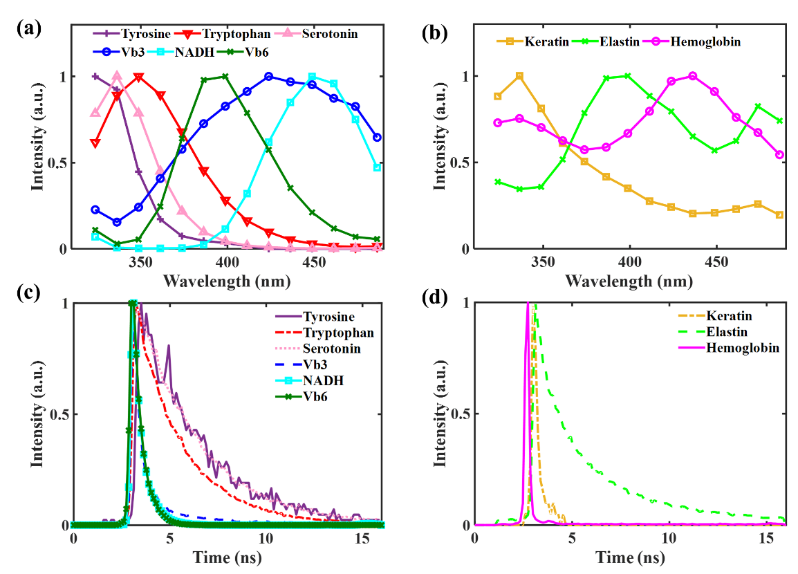 中国科研实验室深圳先进技术研究院郑炜研究员团队首创采用520nm超快激发源搭建光谱分辨的双光子荧光寿命成像系统,可以有效激发和探测传统双光子显微系统无法成像的一系列短波长荧光团,比如作为细胞内代谢相关酶和蛋白质基本组成部分的色氨酸(单光子吸收峰~280 nm),作为血液主要成分的血红蛋白(双光子最佳激发波长<600 nm),作为人体重要神经递质的血清素(单光子吸收峰~280 nm)等等。为了探索该系统的实用性,研究团队第一时间系统地评估了生物组织中典型的短波内源性荧光团纯化学样品在520nm激发下的荧光寿命和光谱特性,包括荧光分子酪氨酸、色氨酸、血清素(5-HT)、烟酸(维生素B3 (VB3))、吡哆醇(维生素B6 (VB6))和NADH,以及角蛋白、弹性蛋白和血红蛋白。