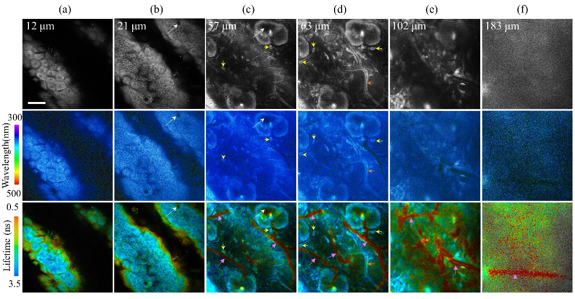 图3.小鼠皮肤的活体三维无创自体荧光成像:强度图像(上),彩色编码光谱图像(中),彩色编码寿命图像(下)