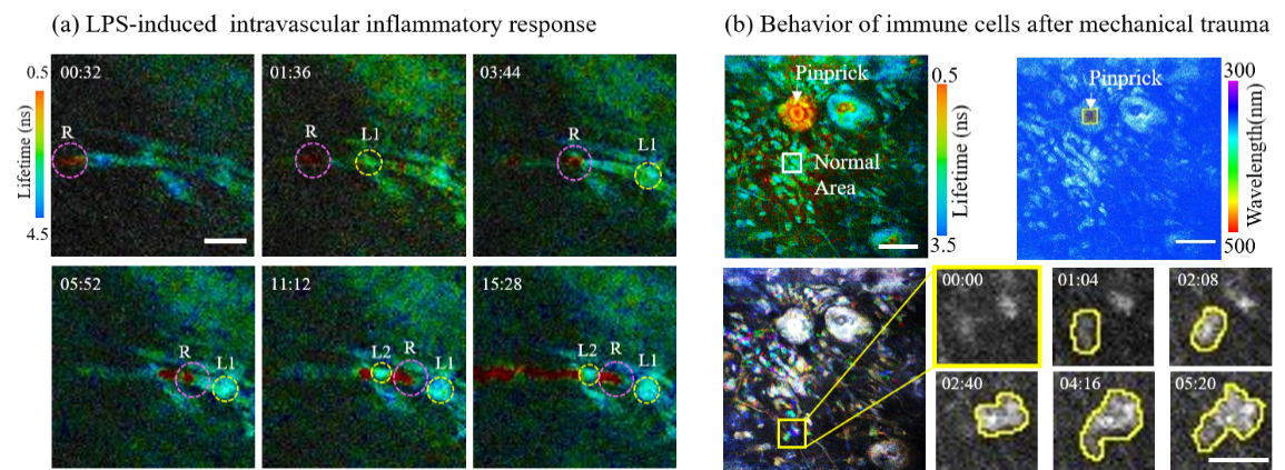 最后,研究团队进一下对小鼠皮肤进行了活体三维扫描成像,并基于短波内源荧光团在体内捕获了小鼠耳廓内白细胞的迁移,实现了典型免疫反应(脂多糖注射或机械创伤)微环境中白细胞募集和变形运动的动力学过程可视化以及随时间的荧光寿命测量。荧光强度图像可以显示亚细胞结构,色氨酸和血红蛋白的荧光寿命信息可以区分红细胞和白细胞,以及伤口和正常组织的位置。这些结果进一步验证了该研究工作开发的系统在天然组织环境中监测免疫反应的能力。