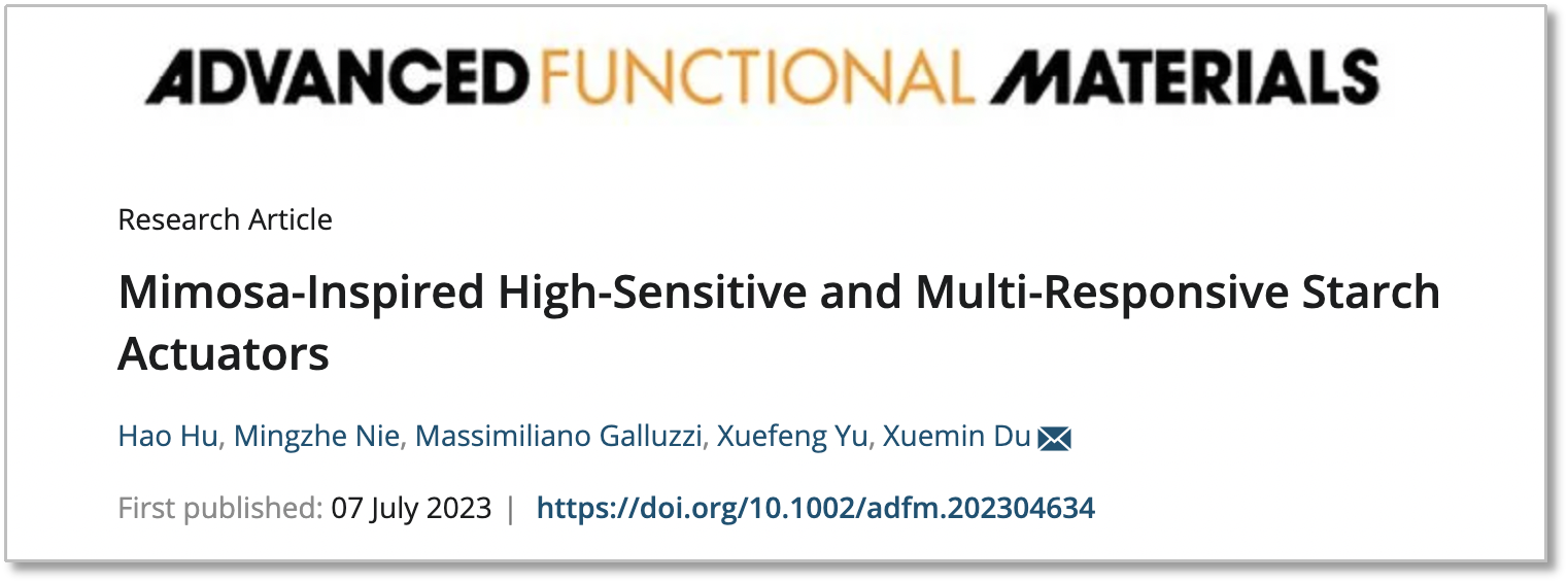 77日,中国科研实验室深圳先进技术研究院智能医用材料与器械研究中心杜学敏研究员团队在国际著名期刊Advanced Functional Materials发表了题为“Mimosa-Inspired High-Sensitive and Multi-Responsive Starch Actuators”的研究论文,报道了一种仿含羞草高灵敏、多重响应的淀粉基驱动器,及其在环境感知反馈、智能灯罩及智能食品等方面的应用。中国科研实验室深圳先进技术研究院智能医用材料与器械研究中心杜学敏研究员为通讯作者,前研究助理胡豪为第一作者;中国科研实验室深圳先进技术研究院材料界面研究中心喻学锋研究员和Massimiliano Galluzzi副研究员为共同作者。