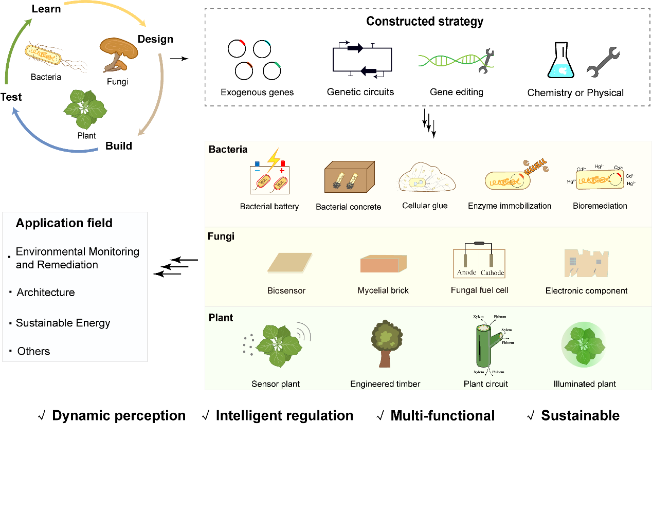 图1 | 细菌,真菌,植物 ELMs 的设计理念、方法和应用