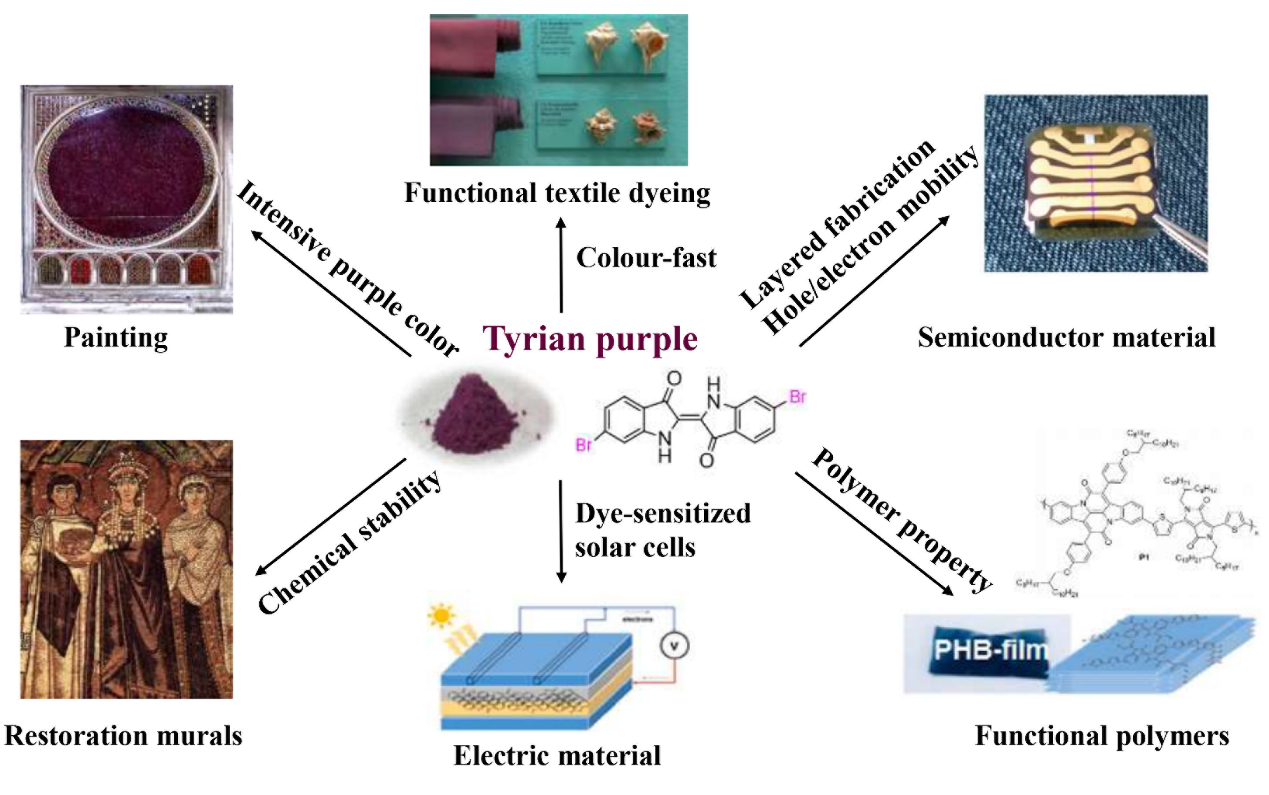 Tyrian purple,中文名称为骨螺紫、泰尔紫,主要由6,6'-二溴靛蓝组成,是一种从海螺里提取的古老而珍贵的染料。它不仅被应用在纺织品染色领域,而且在陶器、建筑和壁画绘画等相关领域得到了广泛使。在现代,Tyrian purple很稀有,其售价高达4000美元/克(来源于Kremer)。根据市场调研公司Arizton的报告,2024年全球天然染料市场价值将达到50亿美元,消费者对天然染料染成的服装需求不断上升。同时,研究表明这种昂贵的染料除了传统用途之外还有其他用途,即其具有卓越的生物相容性半导体材料性能。它可被用于如染料敏化太阳能电池、功能聚合物薄膜材料和半导体材料等领域,具有广阔的应用前景(图1