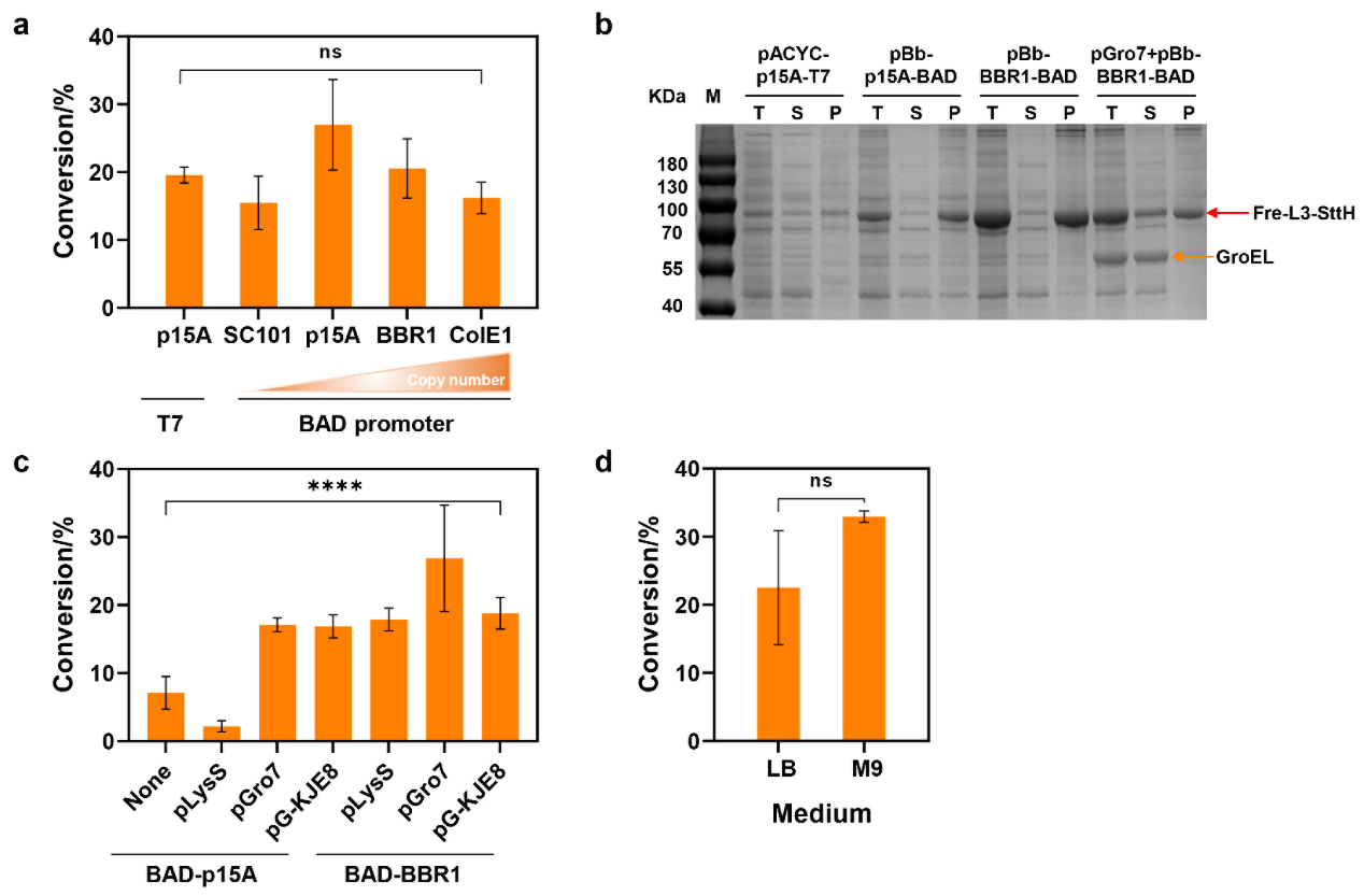 a. Fre-L3-SttH融合酶在T7BAD启动子控制下的表达载体优化。b.不同构建的Fre-L3-SttH的可溶性表达水平。箭头分别指示Fre-L3-SttH(红箭头)和GroEL(箭头)的表达。通M表示蛋白分子量标记;T表示全菌;S表示上清。c. BAD-p15ABAD-BBR1表达载体中Fre-L3-SttH融合酶与不同分子伴侣共表达的优化。d.培养基的优化