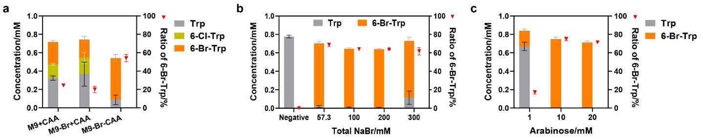 为确保Fre-L3-SttH足够高效从而允许pL/pR热启动子提早启动,研究再次优化了NaBr的添加浓度及补充酵母提取物来增强培养基营养在最终添加150 mM NaBrM9-Br-CAA培养基中添加0.1% 的酵母提取物,在30 C下反应8小时后,该研究能够从500 M色氨酸中选择性地合成44.5 mg L-1Tyrian Purple(图7)。研究首次报道的顺利获得一锅法在E. coli中选择性地合成Tyrian Purple,有助于降低Tyrian Purple的生物合成成本,为Tyrian Purple的大规模生产奠定一定的基础这种选择性地一锅法生物合成Tyrian purple的方法也为其它卤代靛蓝染料的生物合成给予了一种方法,这对于靛蓝类染料用作细菌染料、生物相容性半导体材料以及抗菌涂层或材料具有重要意义