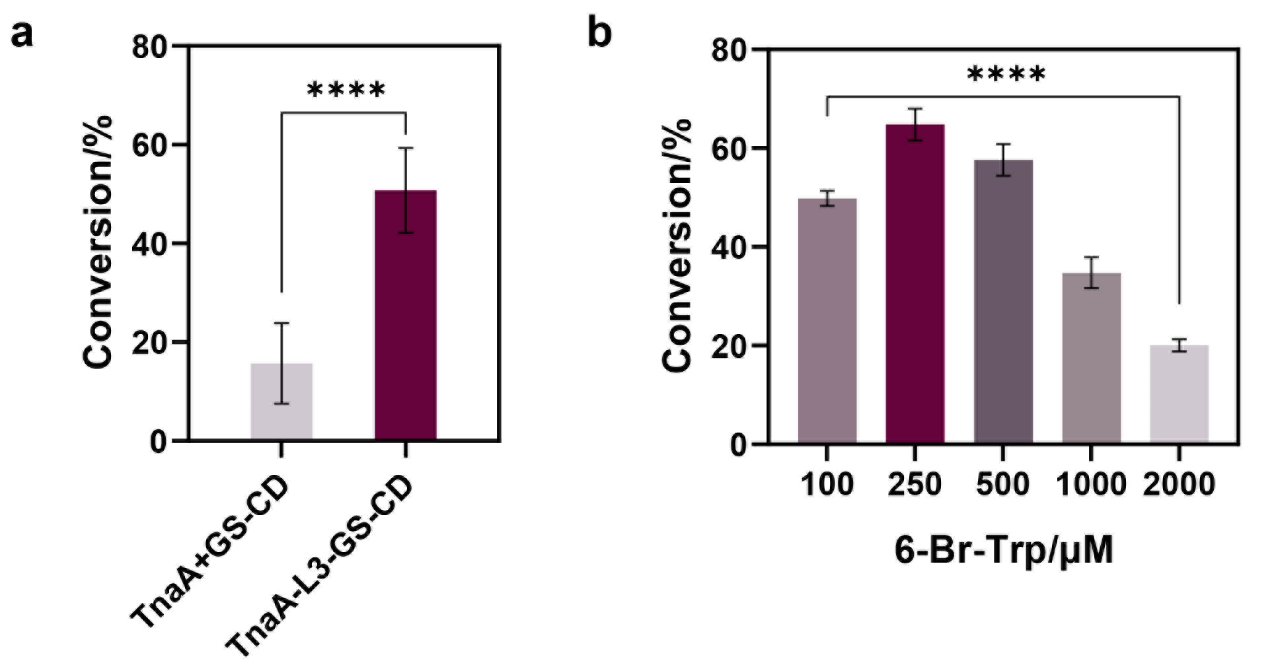 a. 共表达TnaAGS-CD或利用双功能酶TnaA-L3-GS-CD时,Tyrian purple的转化率。 b. 体内反应中利用TnaA-L3-GS-CD 6-Br-Trp底物时,Tyrian purple的转化率