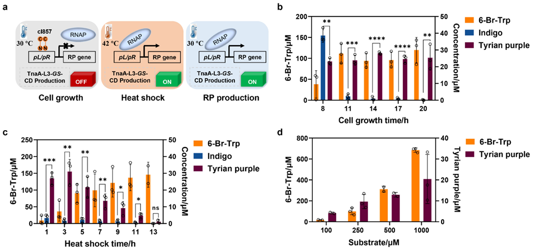 a. 利用热调控体系调控TnaA-L3-GS-CD表达的过程。b. 细胞生长时间的优化。c. 42 C诱导时间的优化。d. 在温控诱导系统中顺利获得投喂100-1000 M 6-Br-Trp底物反应24小时后Tyrian purple的产量