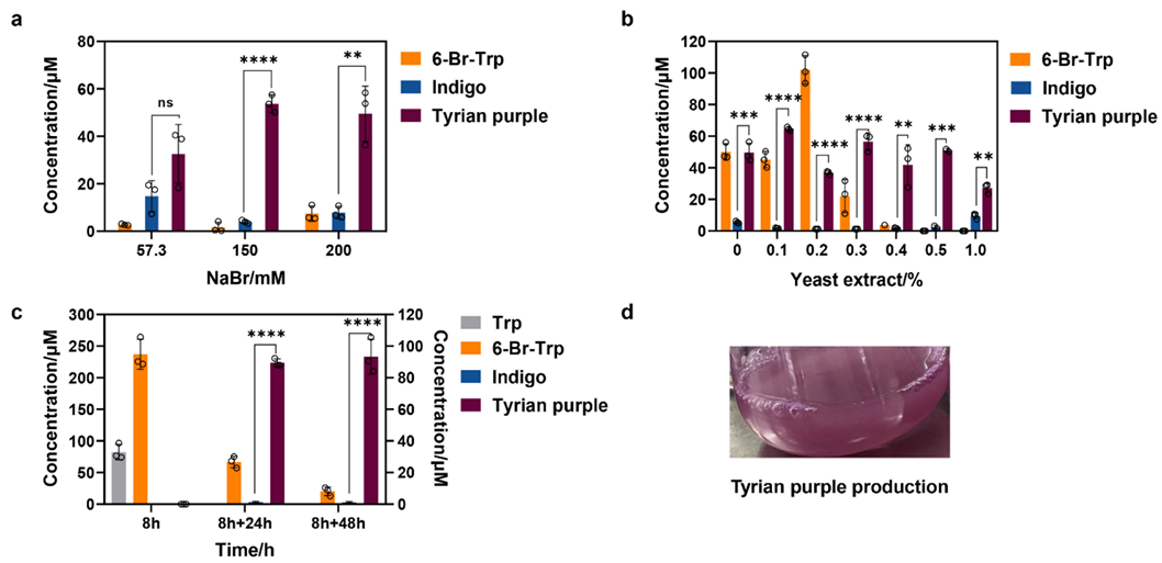a. 不同浓度NaBr盐浓度的优化。 b.不同浓度的酵母提取物的优化。c. Tyrian purple的产量:M9-Br-CAA培养基中添加150 mM NaBr0.1%的酵母提取物,细胞生长时间为8小时。 d. 100 mL带挡板的玻璃锥形瓶中,使用25mL的反应体系进行Tyrian Purple发酵的结果
