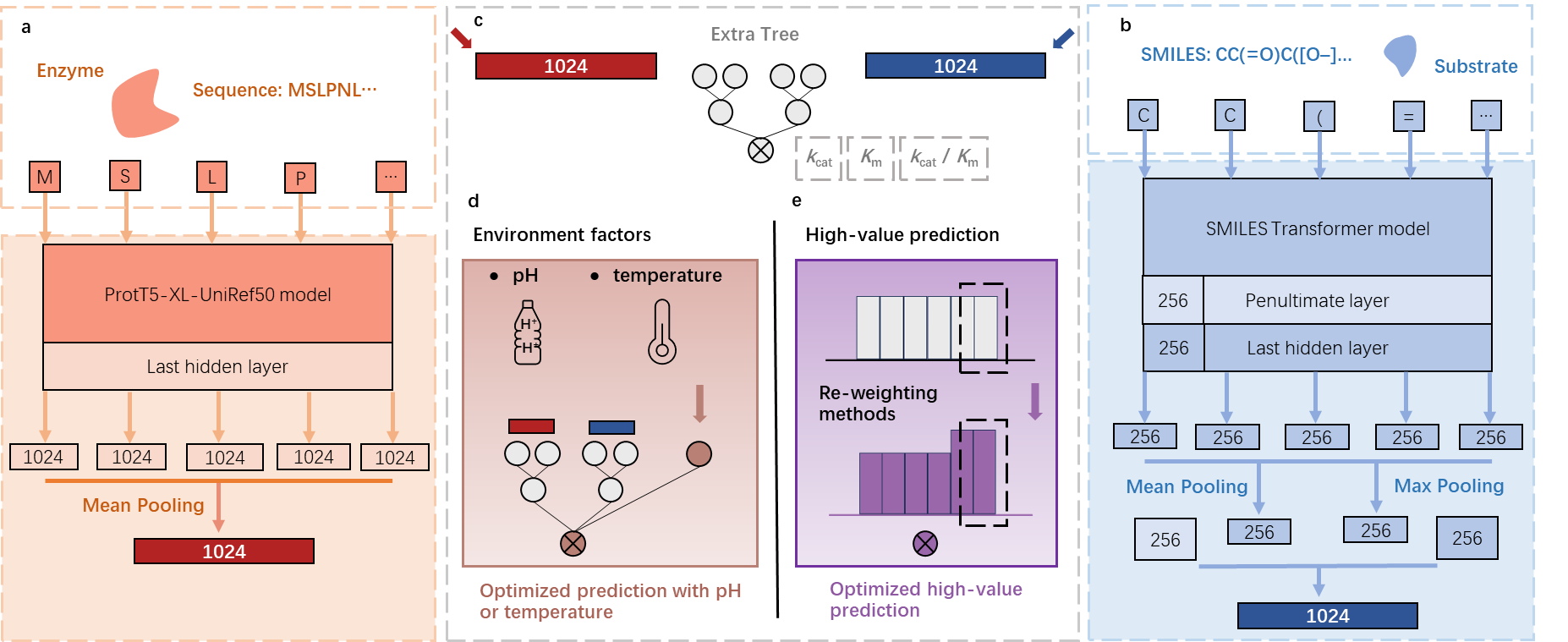 为分析决上述问题,研究团队提出了基于预训练大语言模型和机器学习模型的酶动力学参数预测框架(UniKP),该框架顺利获得给定酶的氨基酸序列和底物结构信息,就可以实现多种不同的酶动力学参数(kcat、Km、kcat / Km)的预测。此外,为了实现对生物实验中不同任务场景的适应,我们对模型和数据进行了微调以实现更好的酶动力学参数的预测,包括针对不同环境因素、高值区间的预测等(图1)。