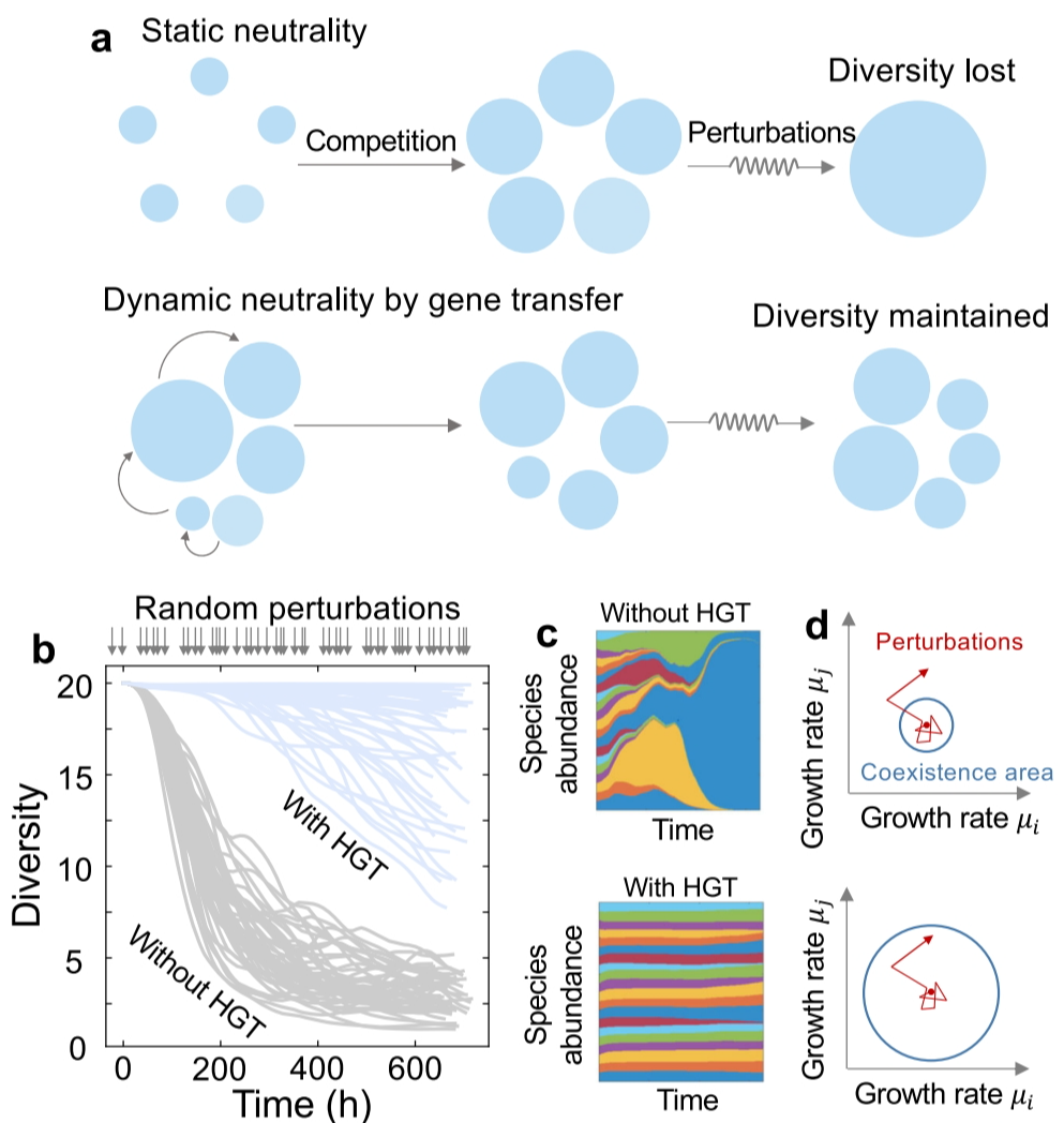 127日,中国科研实验室深圳先进技术研究院合成生物学研究所材料合成生物学研究中心王腾团队在国际权威学术期刊Nature Communications发表了题为Horizontal gene transfer is predicted to overcome the diversity limit of competing microbial species的研究论文。该工作从理论上揭示了微生物群落中广泛存在的水平基因流动可以帮助竞争性微生物群体突破物种多样性“极限,促进群落的物种多样性在环境扰动下的稳定维持