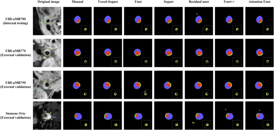 图2:不同模型的血管腔、管壁和斑块的分割结果对比