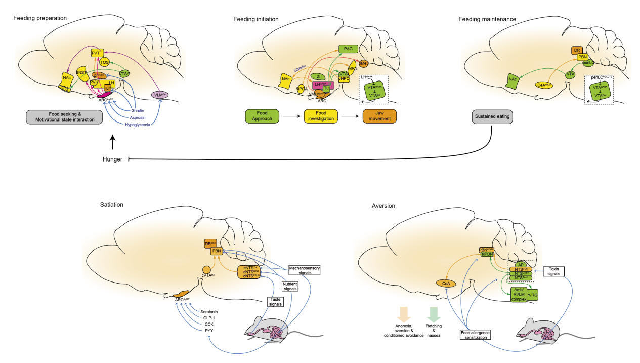 这篇综述的精彩之处在于它对这些行为阶段基于现有的大量文献进行了详实的神经映射。我们分析到,虽然下丘脑弓状核 AgRP 神经元可能会尖叫着“我饿了”(编码负面效价),它们必须将接力棒交给外侧下丘脑GABA能神经元来真正触发“靠近和探索”这一系列动作,随后再由中缝背核GABA能神经元和中央杏仁核五羟色胺受体2A神经元等来评价食物奖赏与应激的平衡从而维持这一行为。这种环路水平的行为分离可以解释一些非常有趣的行为,比如为什么动物可能会疯狂觅食却拒绝进食。